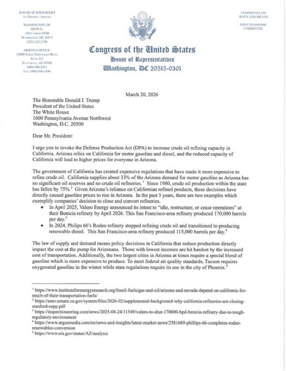 Arizona still relies on California for about 33% of our gasoline and diesel. That means when California takes refining capacity offline, Arizona families feel it almost immediately. This is exactly why I sent a letter to President Trump urging him to invoke the Defense Production Act to stabilize and expand refining capacity in California. One economic report warned those refinery shutdowns could mean another $2 a gallon in Arizona. For families already stretched thin, that is real money.